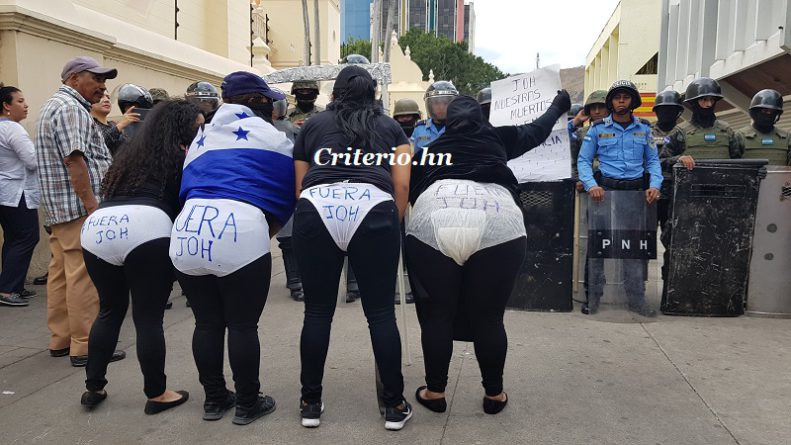 Eva Fernández, excandidata a diputada por el Partido Libre en la Alianza de Oposición fue una de las coordinadoras de la manifestación femenina y manifestó a criterio.hn que llegaron a la protesta con calzones con inscripciones «Fuera Joh», palos, cacerolas, palas, machetes para no andar con las manos vacías porque los seguidores del presidente Juan Hernández (militares), andan con fusiles y matan a los manifestantes y este día con este tipo de protesta están diciendo que ya no quieren más sangre ni que sigan matando a su gente.