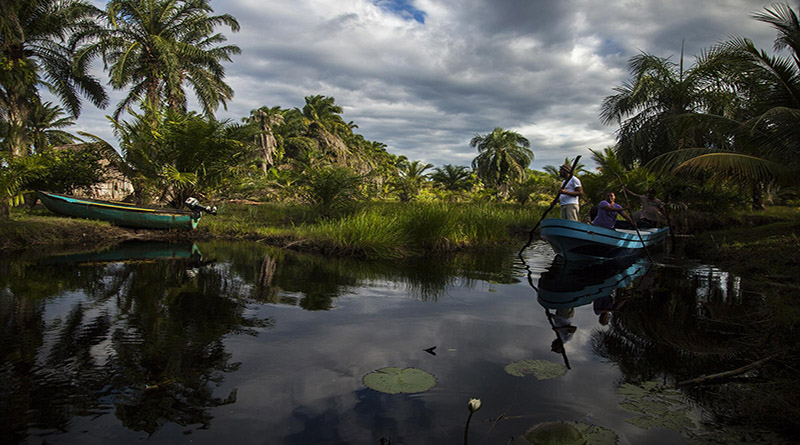 Un cayuquero traslada a un habitante por el río Leán, en Atlántida, Honduras. El joven cayuquero asegura que los habitantes han decidido no bañarse río abajo debido a la contaminación que causa una planta procesadora de Dinant, una de las principales productoras de aceite de palma. / Foto El Faro: Víctor Peña
