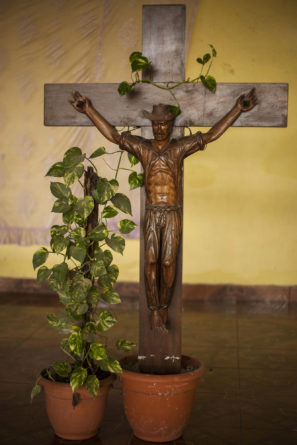 Representación de la muerte del líder campesino Felipe Huete, quien fue asesinado el 3 de mayo de 1991, durante la contrareforma agraria de Honduras, que puso en conflicto a campesinos y terratenientes. La comunidad está ubicada a 100 metros de la planta procesadora de Dinant, ubicada a las orillas del río Lean, en el Valle de Lean, municipio de Arizona, Atlántida, Honduras. / Foto El Faro: Víctor Peña