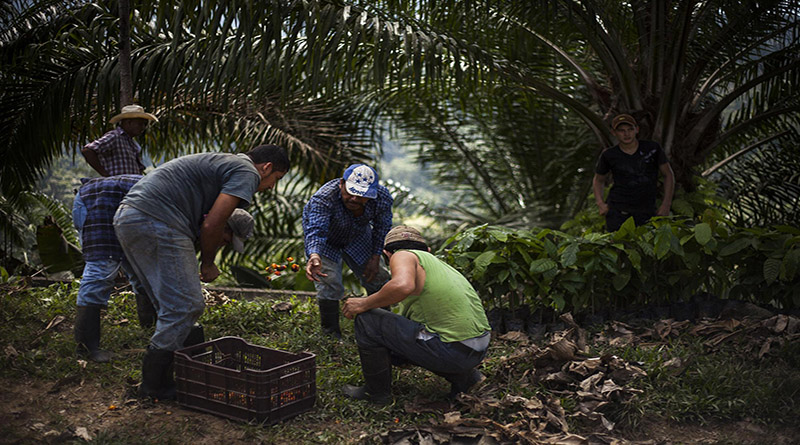 Sus mejores plantas están en unas laderas pronunciadas de la sierra. “Esto es una belleza. Estoy encantado”, dice. Vende a $1.60 la libra de cacao. Una persona puede cosechar mil libras en dos días. Dice que la siembra de cacao es más fácil que la palma, menos peligrosa, la planta está menos propensa a las enfermedades. Lo último en su lista de beneficios tiene que ver con el medioambiente. “Cuando la palma colapse, ya tengo la tortilla segura. Yo no quiero llegar a viejito con bordón y no tener nada. Mejor ahorita que todavía puedo luchar”, dice Rómulo.