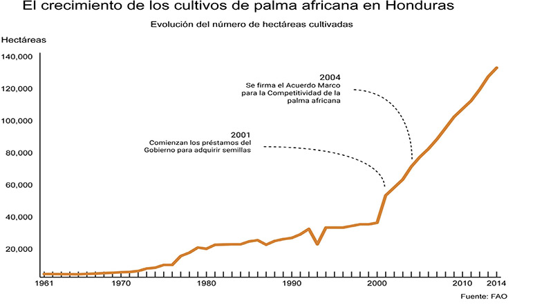 Honduras no quiere bosque, quiere aceite de palma. Entre 2004 y 2017, la superficie de palma africana (Elaeis guineensis) se duplicó en el país, pasando de 69,000 hectáreas a cerca de 150 mil hectáreas, el tamaño de la ciudad de México. El presidente Juan Orlando Hernández prometió a inicio de su gobierno, en 2013, duplicar los cultivos, así como la cantidad de plantas procesadoras, que en este momento son 15.