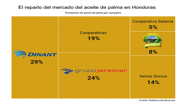 Tres empresas controlan el 61 % de la producción de aceite en el país: Corporación Dinant, Grupo Jaremar y Aceydesa. En teoría, la ley prohíbe a las empresas comprar fruta producida en terrenos no habilitados, pero en la práctica la ley no existe. Monchito muestra en su celular un mensaje recibido un día antes. “Grupo Jaremar y Agrotor avisa a sus productores que a partir del 2 de diciembre el precio de la tonelada de fruta sube Lps. 150”.