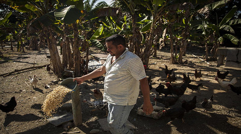 Elías Espinoza da de comer a sus gallinas, en su vivienda sumergida en un mar de palma africana, cerca de la fabrica CAICESA, propiedad de Grupo Jaremar./ Foto El Faro: Víctor Peña