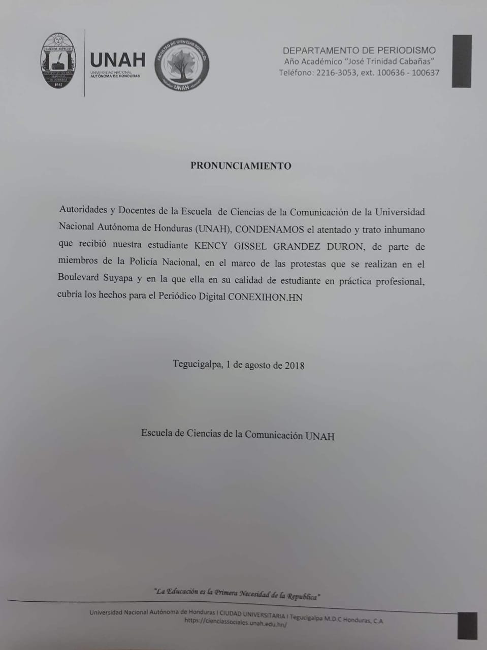 La Escuela de Periodismo de la UNAH se pronunció y condenó las agresiones contra la periodista quien es alumna de esa facultad y esta en su práctica profesional.