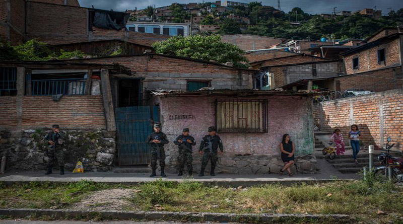 Oficiales de la policía militar patrullan Tegucigalpa. Hernández sacó al ejército a las calles y el índice de homicidios disminuyó, sin embargo, Honduras sigue siendo uno de los países con mayor mortalidad en el mundo. CreditDaniele Volpe para The New York Times