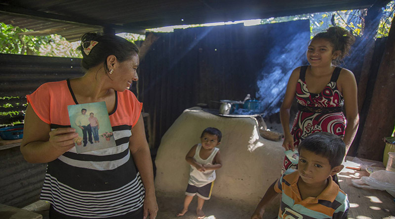 Edis Hernández, en la localidad hondureña de El Negrito, Yoro, sujeta una fotografía de su marido Manuel, quien se unió a la caravana de migrantes en dirección a EEUU. TERESA DE MIGUEL