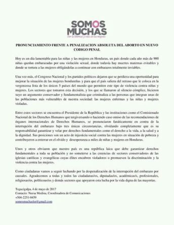 “Hoy es un día lamentable para las niñas y las mujeres en Hondura, un país donde cada año más de 900 niñas quedan embarazadas por una violación sexual, donde todavía hay muertes maternas evitables y donde se tortura a las mujeres obligándolas a continuar con embarazos totalmente inviables”, dice el comunicado