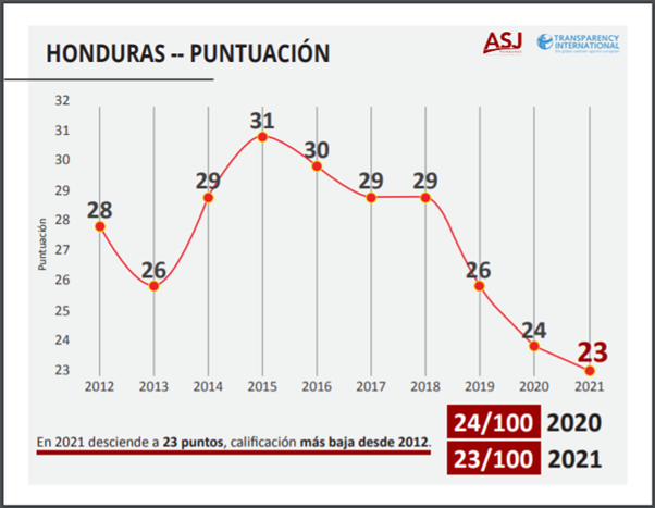 De acuerdo con el informe distribuido por el capítulo de Transparencia Internacional en Honduras, la Asociación para una Sociedad más Justa (ASJ), en los últimos díez años los niveles de corrupción se han estancado, en medio de un entorno de abusos a los derechos humanos y deterioro de la democracia.