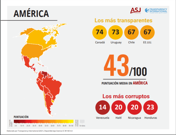 En contraste a Honduras, Nicaragua, Haití y Venezuela, los mejor puntuados en el Índice de Percepción de Corrupción fueron: Estados Unidos y Chile, ambos con 67 puntos, y Uruguay y Canadá con 73 y 74 puntos, respectivamente.