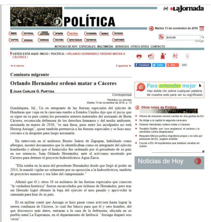 Tegucigalpa.- Un ex integrante de las fuerzas especiales del ejército de Honduras que viaja en la caravana rumbo a Estados Unidos declaró al periodico mexicano La Jornada que el presidente hondureño Juan Hernández fue quien dio la orden para asesinar a la ambientalista Berta Cáceres.