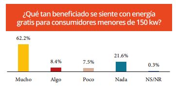 Otro hallazgo es que 7 de cada 10 hondureños se sienten beneficiados con la medida de energía gratis a 1.3 millones de hogares que consumen menos de 150 kilovatios, 6 de cada 10 se sintió beneficiado con la rebaja a los precios de los combustibles.