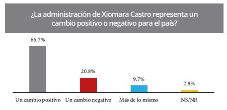Pese que el 47,8% piensa que la presidenta tiene control de su gestión, un 44,4% expresaron que es manipulada siendo el 60,6% que consideran que su esposo, el expresidente y coordinador del Partido Libertad y Refundación (Libre), es quien la manipula, el 20,5% no sabe, el 6,7% considera que sus asesores la manipulan y el 1,9% valoran que Estados Unidos.