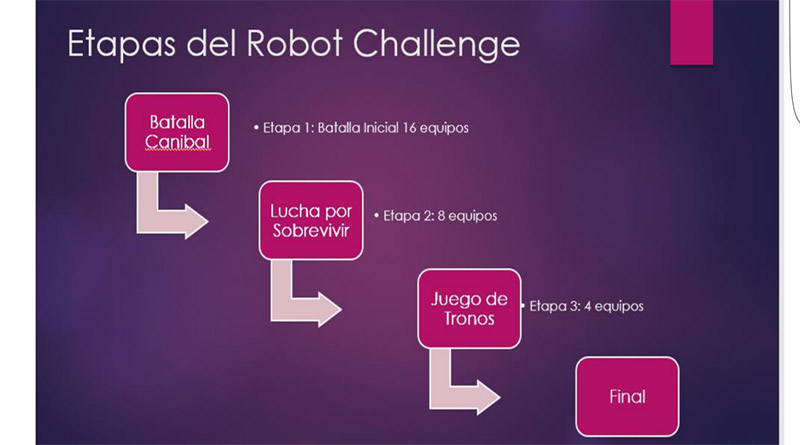- ROBOWAR. Será una competencia de lucha entre robots, donde los participantes deberán elaborar sus propios diseños y poner a prueba sus habilidades, con la finalidad de vencer al contrincante.