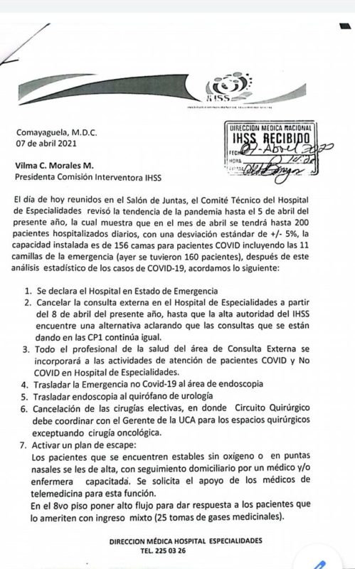 “El comité técnico del Hospital de Especialidades revisó la tendencia de la pandemia hasta el 5 de abril” que muestra que en lo que falta del mes “se tendrá hasta 200 pacientes hospitalizados diarios”, mientras que la capacidad instalada es de 156 camas, incluyendo las 11 camillas de la emergencia, señala una carta fechada el día 7 de los corrientes y dirigida a la presidenta de la Junta Interventora del IHSS, Vilma Morales.