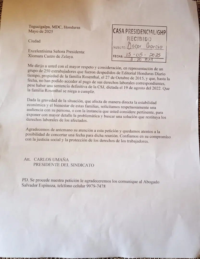 Por otro lado, Germán Mazariegos, confió a Criterio.hn que, debido al incumplimiento persistente de la familia Rosenthal en pagar los derechos laborales de los ex empleados de Diario Tiempo, han decidido presentar una denuncia ante la Organización Internacional del Trabajo (OIT) y en el ámbito nacional, presentaron denuncia ante el Comisionado de los Derechos Humanos (Conadeh).