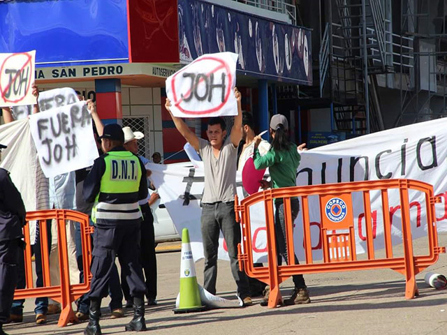 El dirigente de los indignados, relató que fueron atacados por un grupo de activistas que llevó el diputado Reinaldo Sánchez y el alcalde de San Francisco de la Paz, el director del colegio de ese municipio les arrebató una manta grande que decía “Fuera JOH” y los insultó.