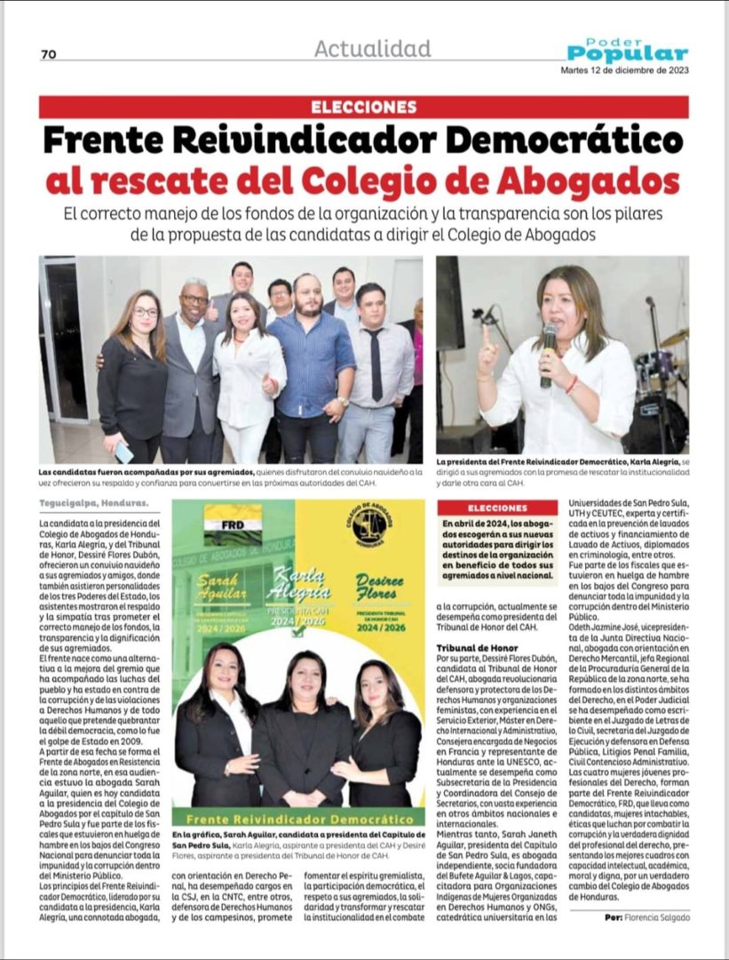 En una publicación del diario oficial del gobierno, «Poder Popular», del martes 12 de diciembre de 2023, se observa una página de propaganda del Frente Reivindicar Democrático. En el texto se informa sobre una reunión organizada por dicho frente, y en la redacción se reconoce que se contó con la asistencia de «personalidades de los tres poderes del Estado», quienes mostraron su respaldo y simpatía hacia las candidatas que integran el movimiento. Hasta el momento, «Poder Popular» no ha dado el mismo espacio de promoción al Frente Patria y Justicia, ligado a los sectores más conservadores, incluido el Partido Nacional, una facción del Partido Liberal y la empresa privada.