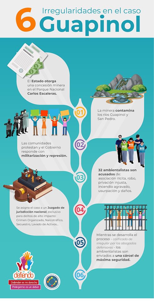 “El 1 de septiembre, la Juez de Jurisdicción Nacional Lisseth Vallecillo dictó de forma ilegal detenerlos sin pruebas suficientes, únicamente, con base de denuncias sin fundamentos presentadas por la empresa minera y el Ministerio Público, con el fin de neutralizar su legítima resistencia al ilegal proyecto minero que afecta la cuenca hidrográfica que abastece de agua a la región”, explica un comunicado del Comité Municipal en Defensa de los Bienes Comunes y Públicos de Tocoa.