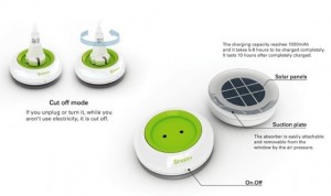 Está compuesto por una ventosa y un diminuto panel solar en su parte posterior, que es la que se pega a la ventana. En el otro lado dispone de un enchufe y en su interior una batería que permite almacenar la energía.