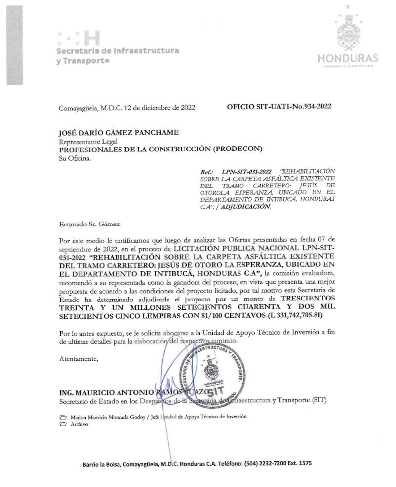 - En diciembre de 2022 la SIT decidió rehabilitar el tramo carretero entre Jesús de Otoro y La Esperanza en el departamento de Intibucá. El monto del contrato es de cerca de 331.7 millones de lempiras y sigue en ejecución con diversos retrasos que han sido denunciados por medios de comunicación y con las justificaciones de la empresa que argumenta que no le han sido efectuados algunos pagos.