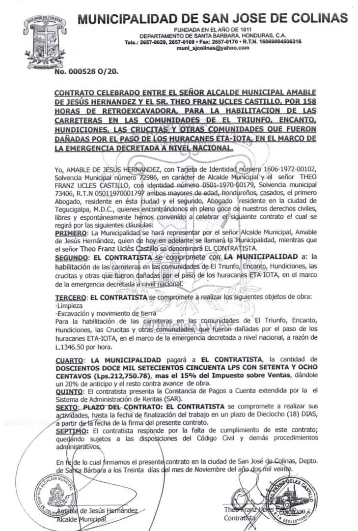 Por otro lado, en 2020 Theo Uclés, amigo cercano de Tony Hernández, ganó dos contratos directos en la alcaldía de San José de Colinas, Santa Bárbara, a pesar de las investigaciones del Departamento de Justicia de Estados Unidos y estar vinculado a un esquema de offshore en Panamá.