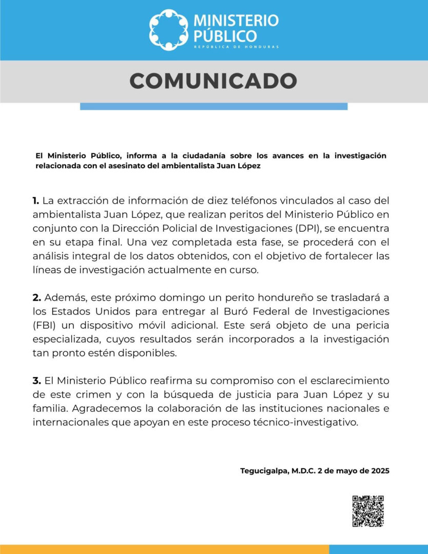 El pasado viernes 2 de mayo, mediante un comunicado el Ministerio Público dio a conocer a la ciudadanía hondureña, los avances obtenidos en la investigación del asesinato del defensor ambiental, Juan López, que esta siendo llevada a cabo en conjunto con la Dirección Policial de Investigaciones (DPI).