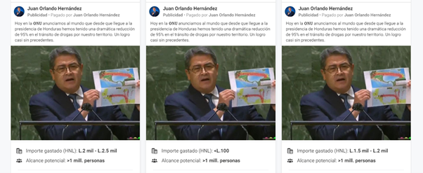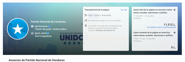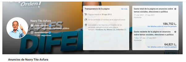 Los datos brindados por la biblioteca de anuncios de Facebook muestran que tanto JOH como Nasry Asfura comenzaron a invertir dinero en publicidad desde el 11 de marzo de 2021, pero, Juan Orlando ha hecho un gasto excesivo en comparación con el alcalde y hasta la misma página oficial del Partido Nacional.