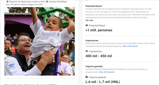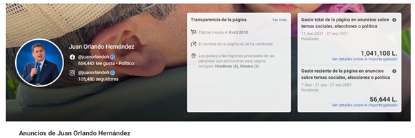 Gracias al acceso de la biblioteca de anuncios de la red social Facebook el equipo de Criterio.hn logró verificar que Hernández ha gastado más de un millón de lempiras en anuncios publicitarios tanto en Facebook como en Instagram.