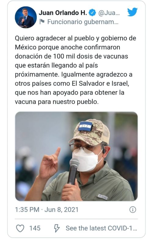 Lo anterior, luego que el presidente de Honduras, Juan Orlando Hernández, anunció la tarde del martes que el Gobierno de México había confirmado la donación y envío de 100 mil vacunas, publico este martes el sitio web Aristegui Noticias.