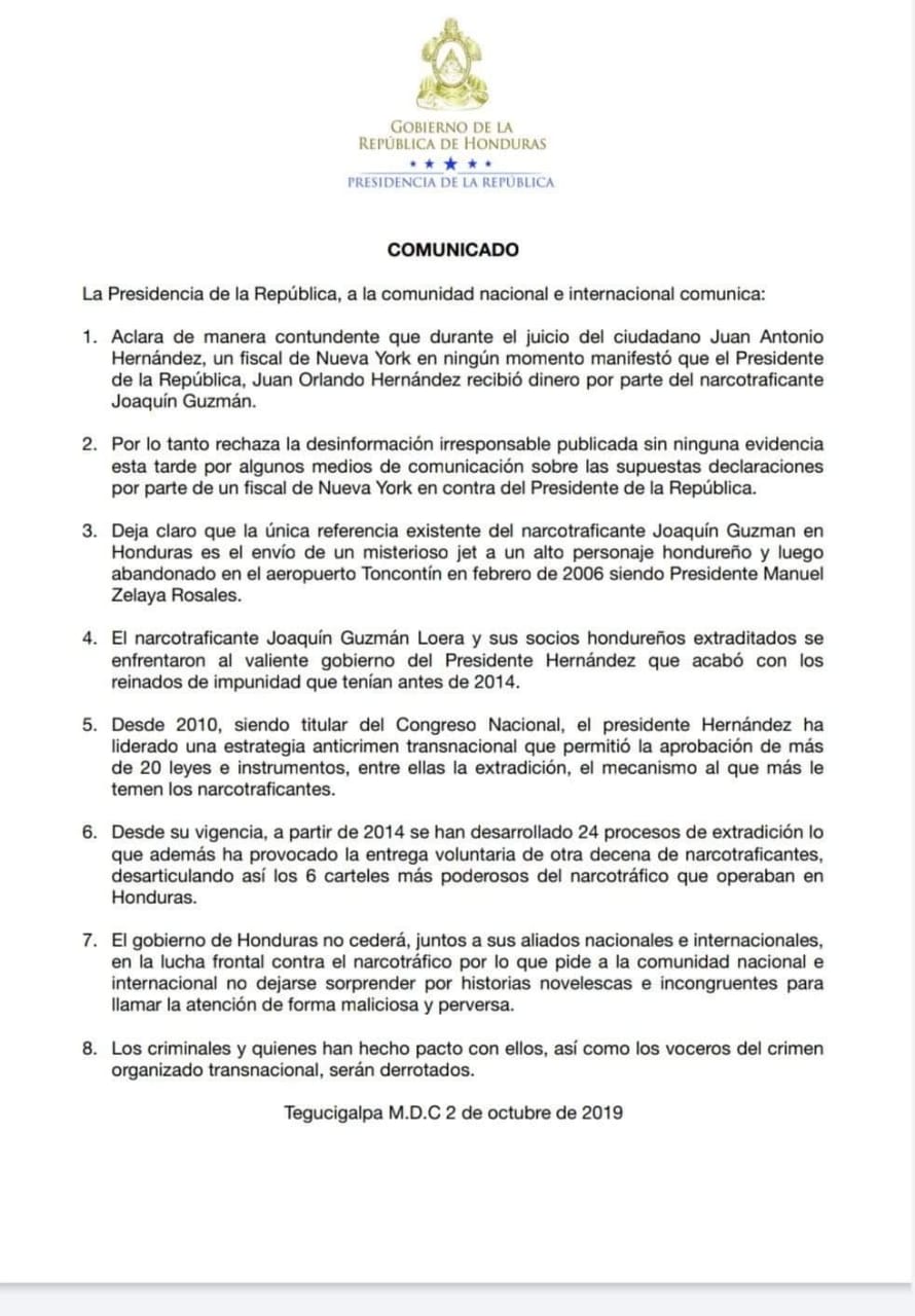 En este comunicado la casa presidencial la Casa de Gobierno de Honduras negó que se haya acusado a Juan Hernández de haber recibido dinero del Chapo Guzmán.