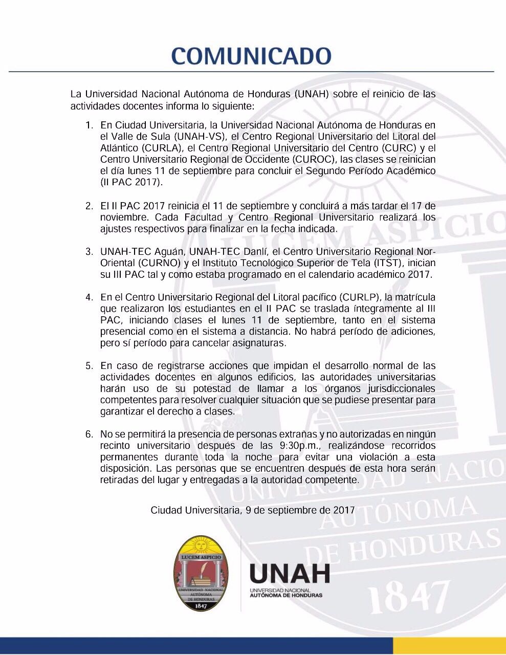 Advierten además que no se permitirá la presencia de personas extrañas y no autorizadas en ningún recinto universitario después de las 9:30p.m., realizándose recorridos permanentes durante toda la noche para evitar una violación a esta disposición. Las personas que se encuentren después de esta hora serán retiradas del lugar y entregadas a la autoridad competente.