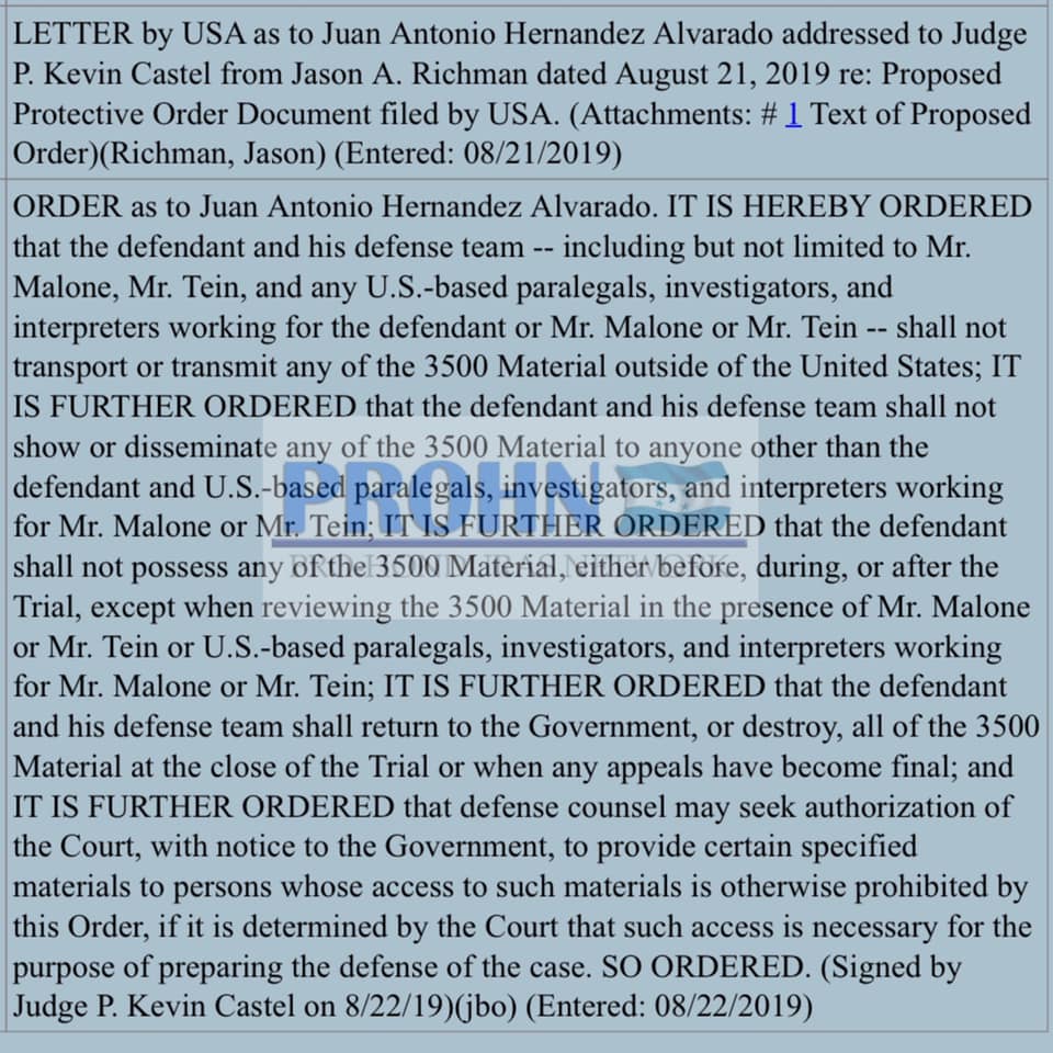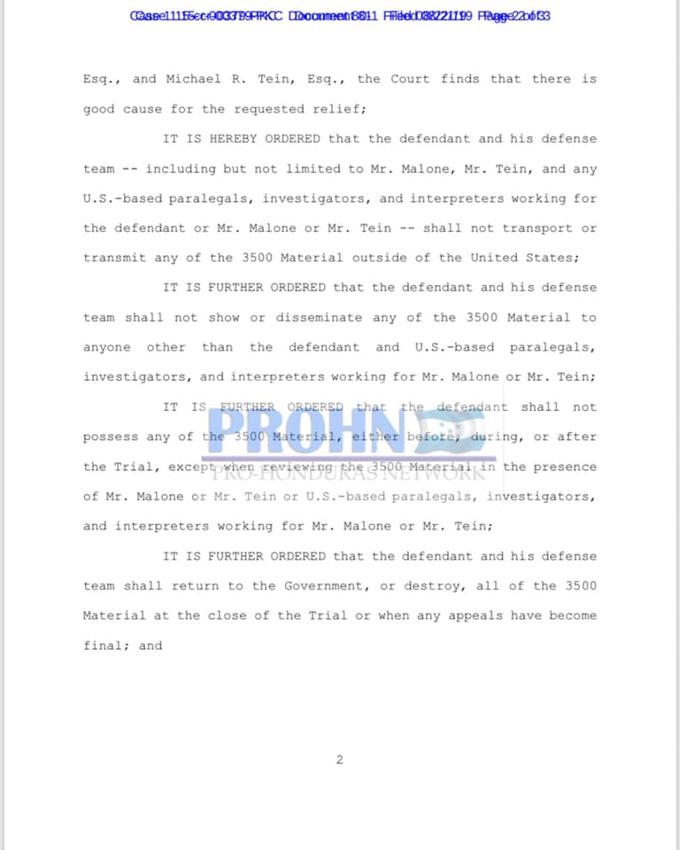 2-Que Juan Antonio Hernández alias «Tony» y su equipo incluyendo abogados, asistentes legales, investigadores e intérpretes con sede en los Estados Unidos, no transporten ni transmitan el material involucrado en las investigaciones fuera de los Estados Unidos, prohibiendo que Tony o cualquier miembro de su defensa muestre o difunda el material confidencial involucrado en el juicio.