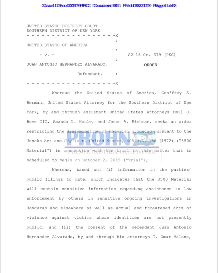 Tegucigalpa.-El juez de la Corte del Distrito Sur de Nueva York, Kevin Castel, admitió este jueves la petición de la Fiscalía para mantener en confidencialidad los testimonios, vídeos, fotografías y pruebas en el caso de Juan Antonio “Tony Hernández, antes, durante y después de que se desarrolle el juicio.