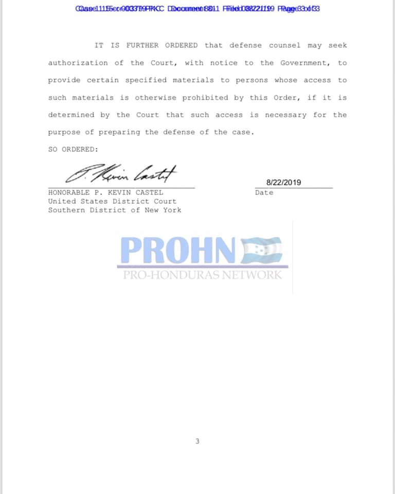 El juez Kevin Castel teme que se filtre información que involucra a terceros y que ya son parte de un proceso de investigación en Honduras
