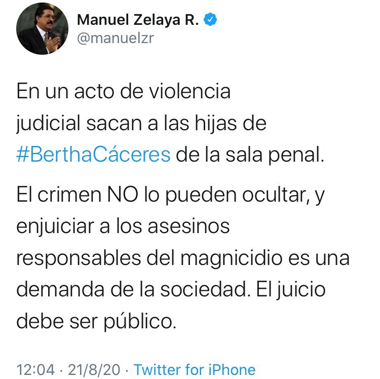 Cabe agregar que previo al desarrollo de la audiencia de este día y teniendo en cuenta las restricciones de movilidad que impiden a la ciudadanía seguir de cerca el desarrollo de las audiencias en el edificio del Poder Judicial, la familia de Cáceres en compañía con el Copinh, había demandado al Poder Judicial transmitir la audiencia del caso para garantizar la transparencia en el desarrollo del emblemático proceso judicial.