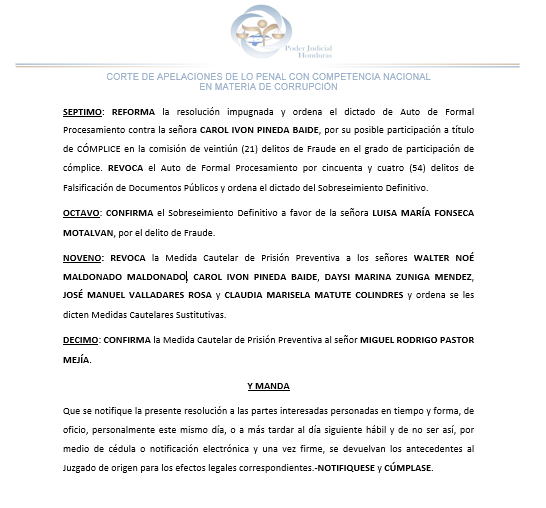 En tanto a Deiysi Marina Zúniga, se le ratificó el auto de formal procesamiento por fraude y se le revocó por falsificación de documentos públicos y en el caso de José Manuel Valladares Rosa, la corte decidió ratificar el auto de formal procesamiento por tres delitos de fraude y decretó sobreseimiento definitivo por falsificación de documentos públicos.