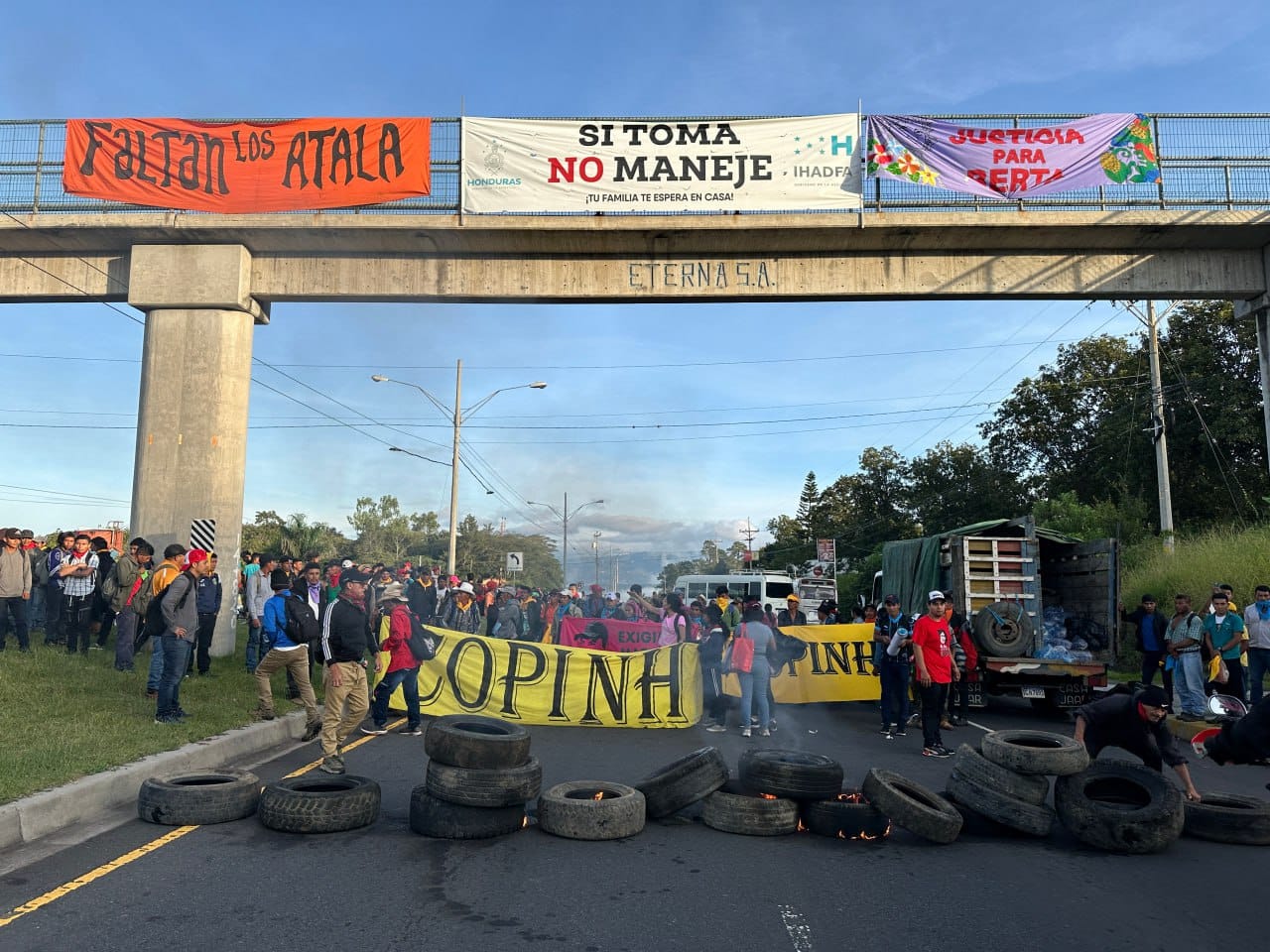 Tegucigalpa. – En una acción de resistencia, integrantes de la población Lenca del suroccidente de Honduras y campesinos del Bajo Aguán realizaron un plantón a la altura del Kilómetro 15 de la carretera CA-5, exigiendo justicia para los lideres ambientales Juan López y Berta Cáceres.