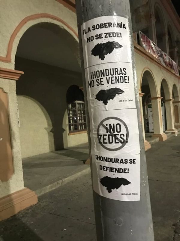 Desde la madrugada de este sábado los miembros del grupo de contra las ZEDE han realizado una campaña de pegado de afiches donde manifiestan su descontento y rechazo por la pretensión del gobierno nacionalista de instalar ese tipo de proyectos en su municipio.