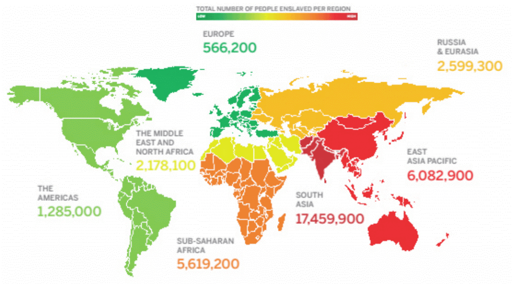 Según esta definición, la ILO cifraría la cantidad de personas esclavizadas en torno a los 21 millones de personas. No obstante, según diversas ONGs dedicadas a recabar información local al margen de los gobiernos y de las Naciones Unidas dichas cifras serían muy optimistas, situándose el número real en torno a los 27 millones en todo el mundo. Sin embargo, la organización Walk Free Foundation situaría la cantidad real en casi 36 millones de seres humanos, asegurando que nuevas investigaciones les han permitido localizar mucha más esclavitud de la que se creía en diversas partes del mundo. Además, este grupo considera también, a diferencia de la ILO, el fenómeno de los niños soldado como una forma de esclavitud. India, China, Pakistán, Uzbekistán y Rusia concentrarían el 61% de todos los esclavos y esclavas del mundo. No obstante, en proporción a su población, Mauritania se encuentra a la cabeza, con un 4% de su población –lo que significan unas 150.000 personas de entre 4 millones– sometida a esclavitud. Por todo ello nos encontraríamos en la época de la humanidad con más personas esclavizadas en todo el planeta, un dato que, si bien podríamos achacar al aumento exponencial de la población humana en todo el mundo, no debe de dejar de ser considerado como algo preocupante.