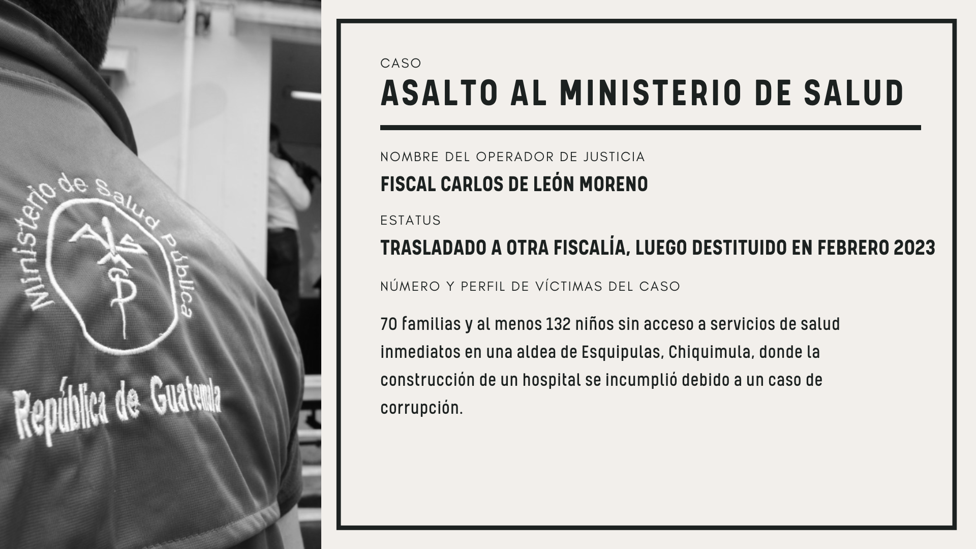 Mientras los fiscales Campo y Pantaleón buscan demostrar su inocencia, otro caso de corrupción también tambalea. Se trata de la penúltima investigación de la CICIG, que se denominó Asalto al Ministerio de Salud, que apunta a cómo la corrupción y la impunidad dejaron a un Ministerio saqueado, una estela de víctimas pobres, un fiscal acusado y separado de sus funciones, y también a un exdiputado y un diputado aliados al oficialismo sin enfrentar la justicia, aunque fueron identificados como responsables.