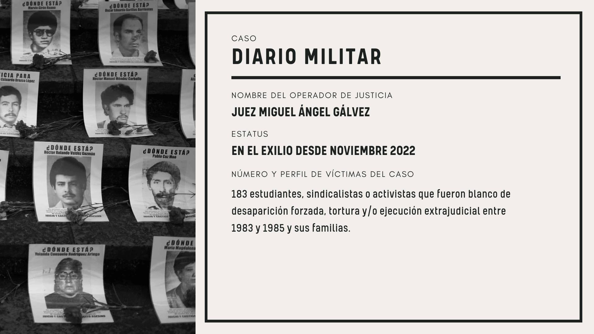 Desde entonces, la Fundación ha solicitado el retiro de la inmunidad a varios fiscales y jueces que llevaban casos de corrupción que fueron abiertos por la Comisión Internacional Contra la Impunidad en Guatemala (CICIG, 2007-2019), como lo hizo con la exfiscal de la Fiscalía Especial Contra la Impunidad (FECI), Virginia Laparra, o el juez Carlos Ruano; o quienes, como Gálvez, llevaban procesos contra exmilitares acusados de crímenes de lesa humanidad y graves violaciones a los derechos humanos.Como titular del juzgado de Mayor Riesgo B, Gálvez envió a juicio a Ríos Montt, condenado por genocidio en 2013, y ordenó en 2015 el proecesamiento por corrupción del expresidente Otto Pérez Molina y la exvicepresidenta Roxana Baldetti. Para el 15 de noviembre de 2022, el juez había denunciado que se violentó el proceso del Diario Militar, había salido del país y anunciado su renuncia. Desde el exilio, el exjuez dijo al periódico digital El Faro que se están desmontando todos los procesos que él llevaba, incluyendo el Diario Militar, y se está arriesgando a los sobrevivientes y testigos con las medidas sustitutivas otorgadas a los militares procesados. Gálvez sostuvo que con este caso entendió que Guatemala está diseñada para la impunidad.