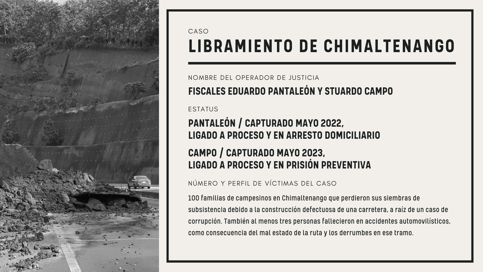 Parece haber nada en común entre el caso Diario Militar, que guarda los registros de 183 personas desaparecidas durante la guerra interna en Guatemala; el caso Libramiento de Chimaltenango, con al menos 100 familias afectadas, y un Estado defraudado; y el caso Asalto al Ministerio de Salud, donde una red de sobornos y el robo de dinero de la construcción de hospitales dejó al menos a 70 familias sin atención médica vital. Sin embargo, un hilo los une.