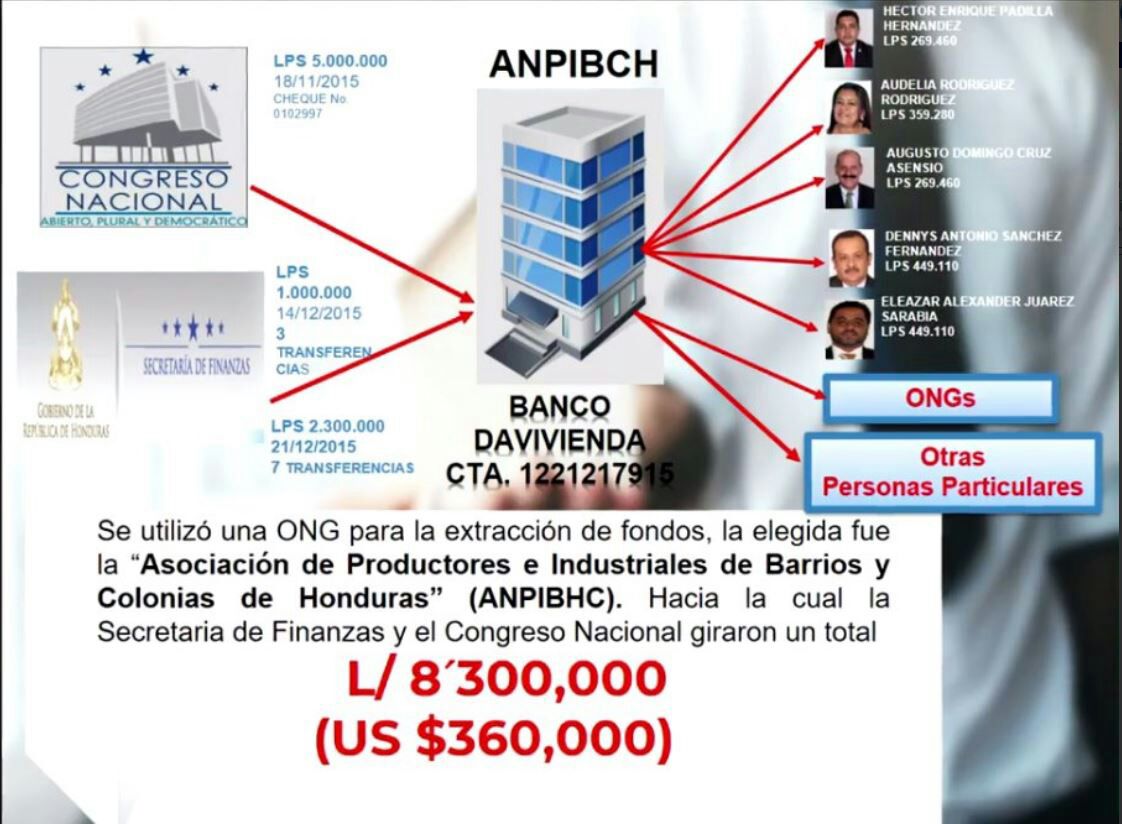 “Los diputados y diputadas solicitaban fondos al Poder Ejecutivo, estos eran entregados a la ONG, la cual enviaba los fondos públicos a los propios diputados. Los diputados y diputada implicados en esta red recibieron 15 cheques directamente desde la cuenta de la ONG Asociación Nacional de Productores e Industriales de Barrios y Colonias de Honduras (ANPIBCH), la cual recibió varias transferencias desde la Secretaría de Finanzas por L. 3,300,000 (lempiras), el 14 y 21 de diciembre del 2015. En total se trasladó a dicha ONG L. 8, 300,000 (Lempiras)”, es decir, más de 6 millones 685 mil pesos”, según se expuso en un comunicado de prensa.