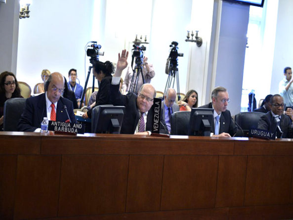 Washington.- Los 34 países de la Organización de Estados Americanos (OEA) aprobaron hoy por consenso una declaración conciliadora sobre Venezuela negociada en una sesión de diez horas que concluyó con el gesto insólito de negar la palabra al jefe de gabinete del secretario general, Luis Almagro.