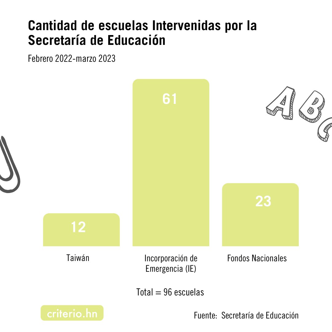 Para el caso, los datos de la Secretaría de Educación, entregados en un libro de Excel con tres hojas, reportan que 61 centros educativos están categorizados como “incorporación emergencia”, 23 centros educativos catalogados como “fondos nacionales” y otros 12 centros educativos como “Fondos China-Taiwán (T), en total 96 centros intervenidos durante el 2022, de acuerdo con el reporte.