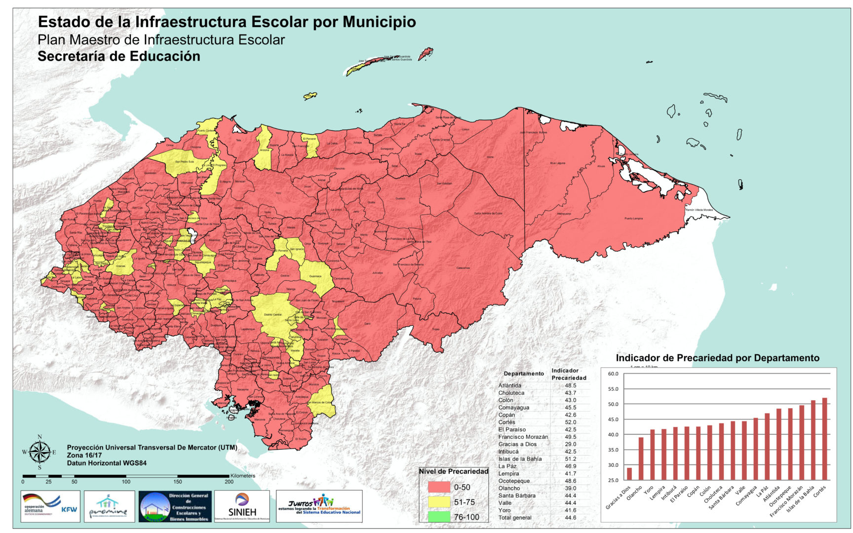 Este es uno de los principales problemas que enfrenta el sistema educativo hondureño, según el Plan Maestro de Infraestructura de la Secretaría de Educación (SEDUC), que refiere que en promedio cada escuela presenta un estado de precariedad del 44.6 %.