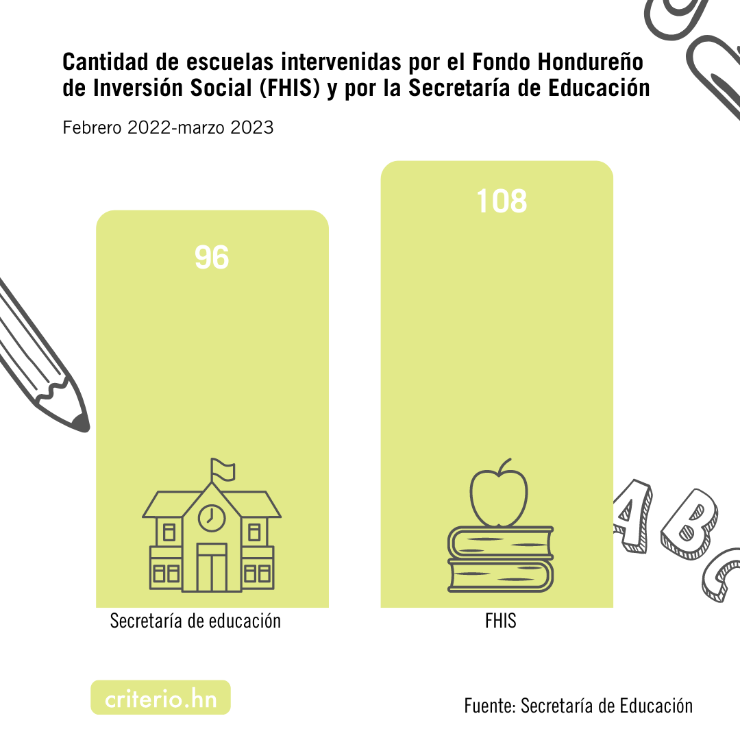 Por su parte, el informe proporcionado por el FHIS enumera 108 centros educativos intervenidos en diferentes departamentos del país.