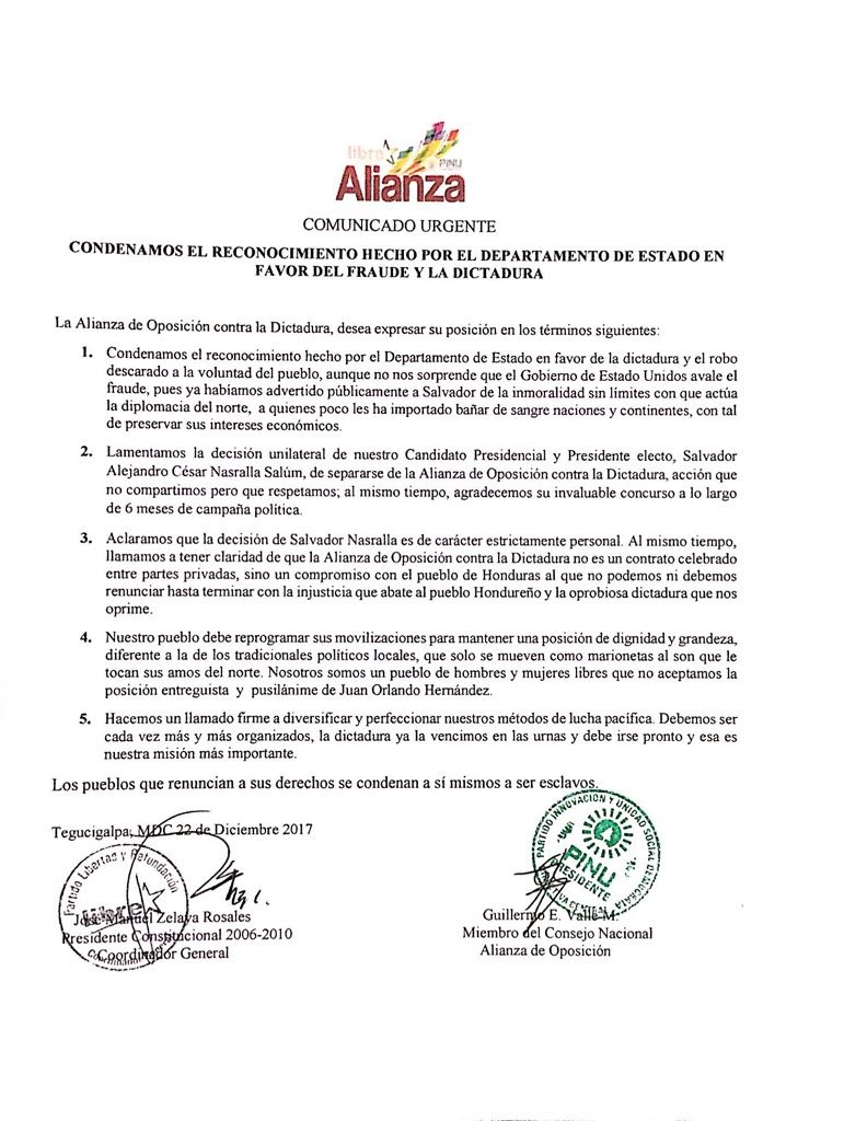 Le dieron lectura a un comunicado donde condenaron el reconocimiento hecho por el Departamento de Estado en favor de la dictadura y el robo descarado a la voluntad del pueblo. El cual presentamos a continuación: