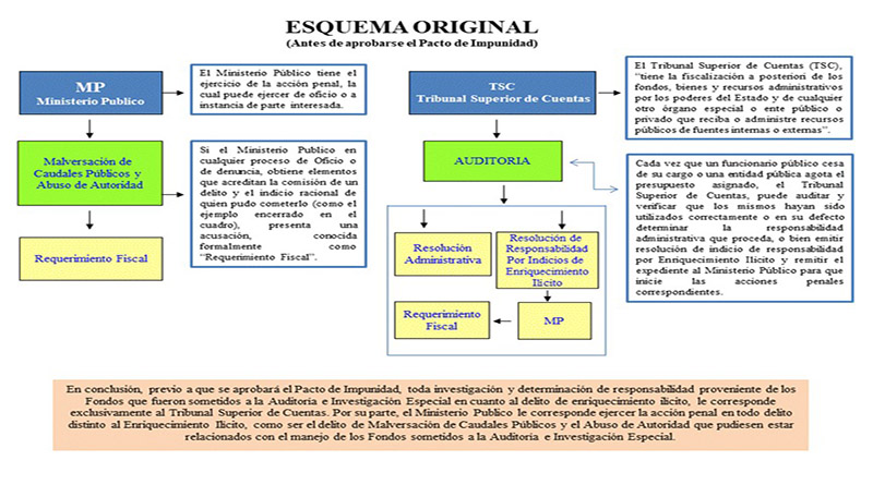El presente documento contiene tres filminas que resumen: (i) el Esquema Original, que relatará el marco de actuación del Ministerio Público y el Tribunal Superior de Cuentas de forma previa a la aprobación del Pacto de Impunidad; (ii) el Pacto de Impunidad, que relatará como el Esquema Original se ve alterado en función de dicho Pacto; y, (iii) la Fe de Erratas, que relatará si en efecto este mecanismo corrige el Pacto de Impunidad para mantenernos dentro del Esquema Original. Finalmente, daremos las conclusiones respectivas.