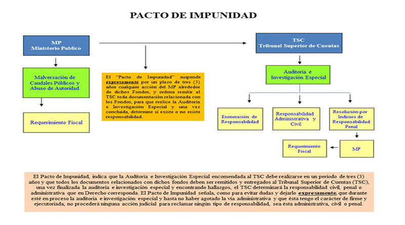 El llamado “Pacto de Impunidad” consiste en una reforma de la Ley Orgánica del Presupuesto, adicionando el Articulo 131 A, que dispone ordenar al Tribunal Superior de Cuentas (TSC) realizar Auditoría e Investigación Especial de todos los fondos públicos gestionados, recibidos, administrados y ejecutados por los Servidores Públicos, Diputados al Congreso Nacional, Organizaciones No Gubernamentales de Desarrollo (ONGD), Organizaciones Privadas de Desarrollo (OPD´s), Fundaciones y en general todas aquellas personas naturales o jurídicas que a cualquier título reciban o administren fondos públicos, cualquiera que sea su origen, comprendidos en los periodos de gobierno 2006-2010, 2010-2014, 2014-2018 (en lo sucesivo los “Fondos”).